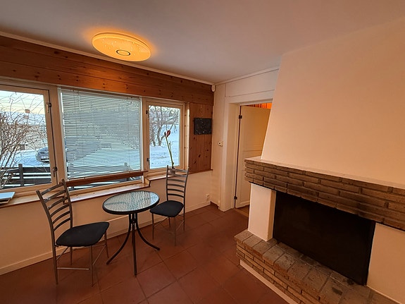 - Stue med peis, god plass til både sofagruppe og spisebord