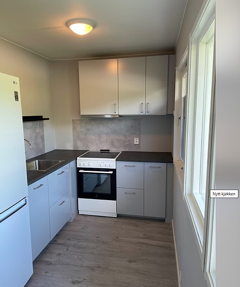 Nyrenovert leilighet med ny, oppvaskmaskin, vaskemaskin, komfyr, nye panelovner, nytt el-anlegg, nytt dursjkabinett og nytt kjøkken etc.