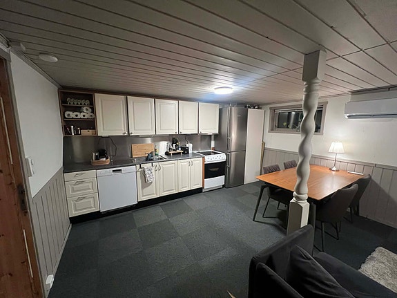 Kjellerleilighet på ca 70 m2. Stue og kjøkken i ett, stort bad med egen krok til vaskemaskin. Leiligheten har et stort soverom og et kontor. God inngang med trapp på utsiden.