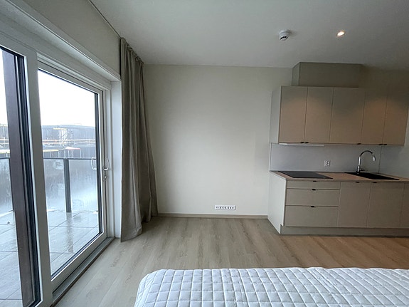Kjøkkenet er splitter nytt og leveres med integrerte hvitevarer. Leiligheten er delvis møblert med helt ny continental-seng, garderobeskap, TV og lystette gardiner – her kan du flytte rett inn.