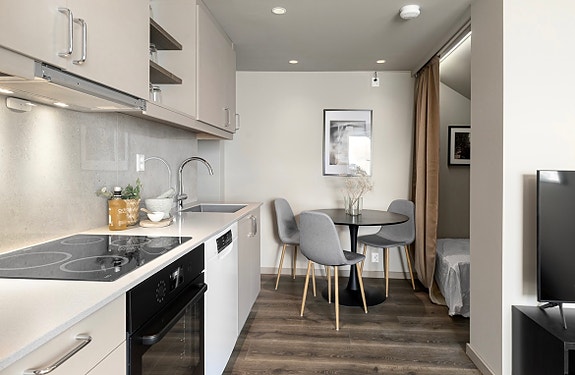 Leiligheten har äpen stue/kjokken lesning med moderne kjokken, nye hvitevarer, 1 soverom + sovealkove og et romslig bad med vaskemaskin og Torketrommel.