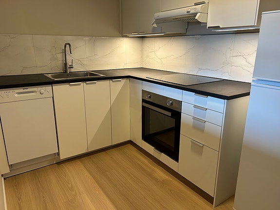 Kvitevarer på kjøkken og vaskemaskin inkludert.