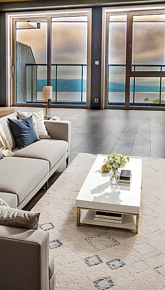 Fantastisk fjordutsikt fra stuen AI-genererte møbler.