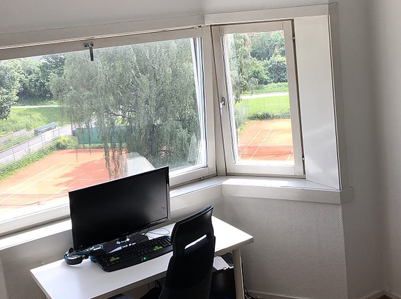 Flott leilighet beliggende i 5. etasje (heis). Dette er det største rommet i kollektivet (15m2) med egen balkong tilknyttet rommet. Det er store vinduer med utsikt over byen.