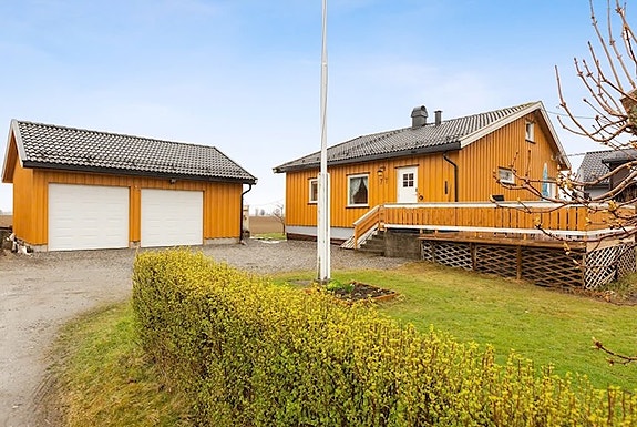 Utendørs byr boligen på stor terrasse, romslig hage og stor dobbelgarasje, noe som gir gode parkerings- og lagringsmuligheter.