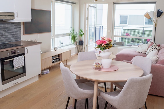 Leiligheten har en gjennomgående og funksjonell planløsning med åpen stue- og kjøkkenløsning, flislagt bad og to gode soverom. Fra stuen er det utgang til en romslig og solrik balkong.