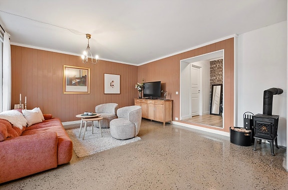 Leiligheten har en moderne og sosial planløsning med åpen stue- og kjøkkenløsning som gir en romslig og innbydende atmosfære. Store vindusflater slipper inn rikelig med naturlig lys og skaper en lys og trivelig bolig. Stuen har god plass til både sofagruppe og spisebord, perfekt for både hverdag og sosiale sammenkomster.