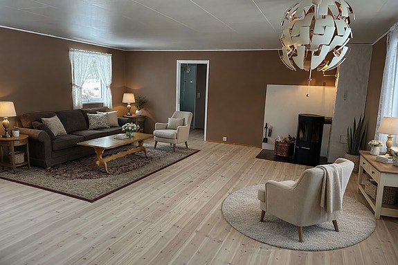 Stor stue med vedovn og stor varmepumpe