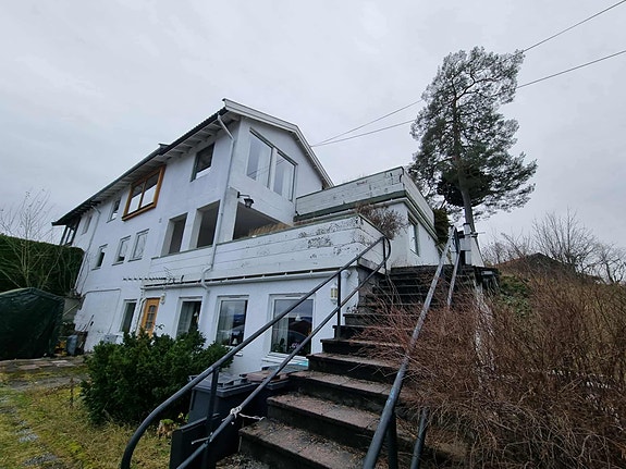 Boligen bærer preg av eldre standard og noe manglende vedlikehold både inne og ute.