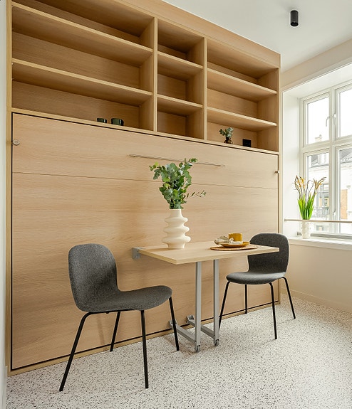 Bilde fra tilsvarende leilighet viser hvordan sengen sjules i hylle bak bordet