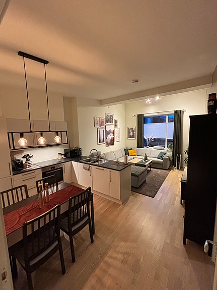 Moderne 2 roms leilighet fra 2015 leies ut i ettertraktet område. God planløsning i leiligheten som utnytter kvadratmetrene godt. Skråtak som på det høyeste er 3,5 meter gir leiligheten et veldig romslig inntrykk. Leiligheten har balansert ventilasjon med varme og kjøling.