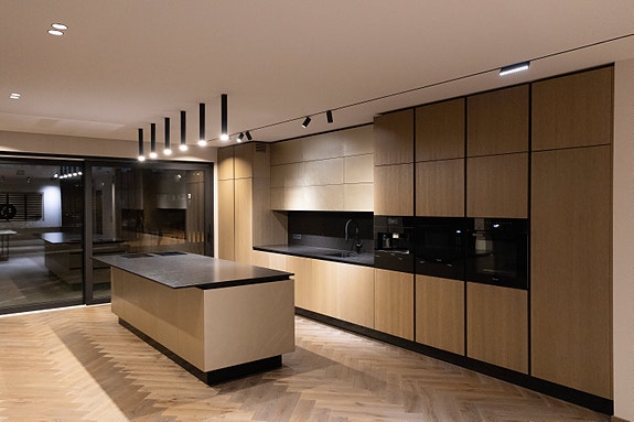 Stor og lys stue/kjøkkenløsning med moderne integrerte hvitevarer.