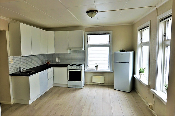Inneholder stue/kjøkken med store vinduer, komfyr, oppvaskmaskin, kjøleskap/frys, ny laminatgulv, 2 soverom med senger, nytt flislagt bad med vaskemaskin, varmekabler og gang.