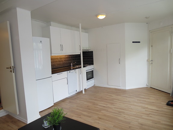 Meget pen 1- roms leilighet beliggende ved Solsiden. Entre, bad med vaskemaskin, oppholdsrom med komfyr, kombiskap (kjøl/frys), oppvaskmaskin og kleskap.