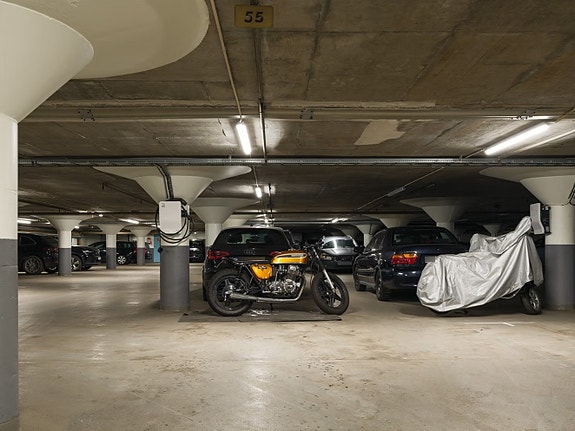 Garasjeplass nr. 55. Romslig parkeringsplass i lukket garasjeanlegg med god plassering. El-billader hører til plassen. Appstyrt åpning av port og inngang (Parqio).