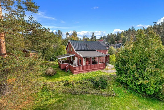 Husets har rolig beliggenhet i et tilbaketrukket boligområde på Enebakkneset. Eiendommen består av en romslig tomt på 1,4 mål, plen og beplantning, garasje og to mindre uthus. I tillegg kan en nyte en flott innglasset balkong! Fra boligen er det kort vei til marka med flotte turområder.
