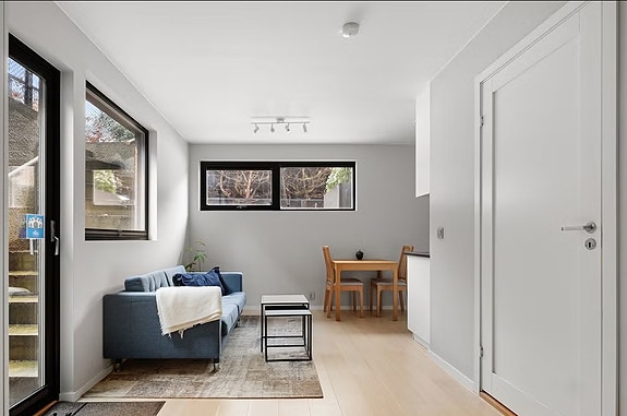 Obs: Vi overtar huset midt i april og møblene på bildet blir byttet ut (siden de tilhører dagens leietaker). Vi planlegger å sette inn 120cm bred seng, kjøkkenbord, sofa, skap og en TV, men er villige til å bytte ut noe møbler etter leietakers behov og ønske. (Dersom du har egne møbler kan vi fjerne noen av våre.)