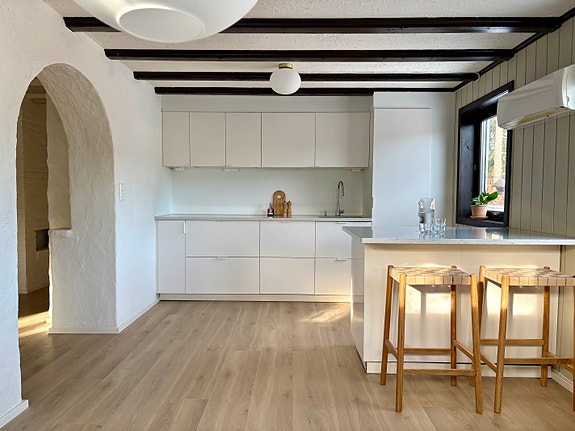 Boligen har gulvvarme og varmepumpe som gir behagelig innetemperatur hele året.