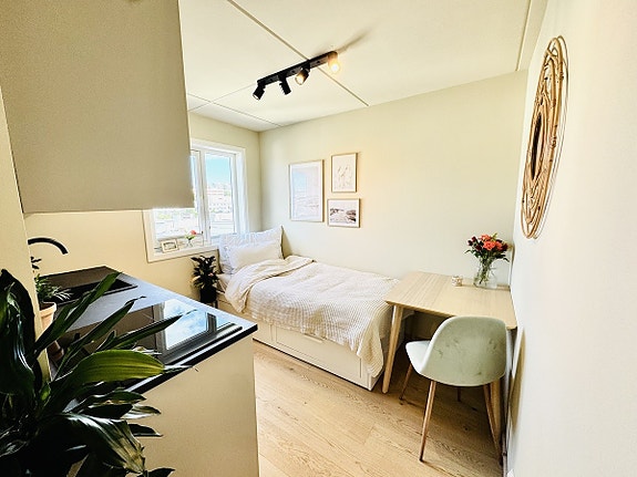 Hybelen er nyoppusset i 2025 og ligger høyt og fritt i 10 etasje med heis.