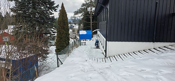 Leiligheten har egen inngang, store vinduer, Ute får du solrik hage .