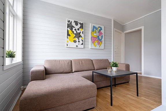 Stuene er ferdig møblert med sofa, TV, stuebord og puffer.