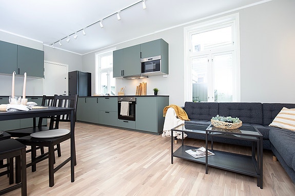 Leiligheten er fullt møblert, med integrerte hvitevarer på kjøkken og vaskemaskin og tørketrommel på badet.