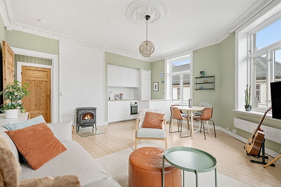 Romslig og åpen stue- og kjøkkenløsning med store vindusflater som gir rikelig med naturlig lys. Klassiske detaljer som stukkatur, rosett og originale tregulv gir rommet særpreg. Stuen har peisovn og god plass til sofagruppe og spisebord. Kjøkkeninnredningen fra Ikea har hvite fronter og god skap- og benkeplass. Integrerte hvitevarer som kjøl/frys, oppvaskmaskin (smal type), stekeovn og induksjonstopp. Praktisk kjøkkenøy gir ekstra arbeidsflate og oppbevaring.