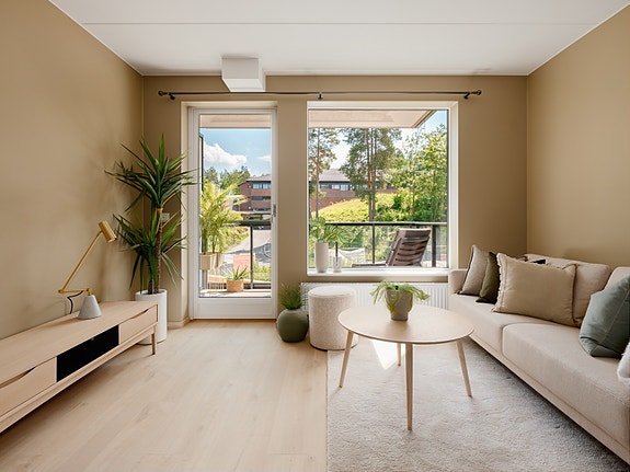 Stuen: Lys og pen stue med store flater som gjør det enkelt å møblere. Flotte fargekombinasjoner som harmonerer med resten av boligen. Stuen er i åpen løsning til kjøkken. God plass til både sofagruppe og spisebord samt tv-møblement. Fra stuen er det utgang til solrik, sydvent balkong på ca. 6 kvm med delvis innglassing. Innglassingen på balkongen kan "pakkes bort" på de beste soldagene, men også brukes til å løye for vind og vær. Balkongen har utelys og kontaktpunkt for eventuelt varmelampe eller elektrisk grill.
