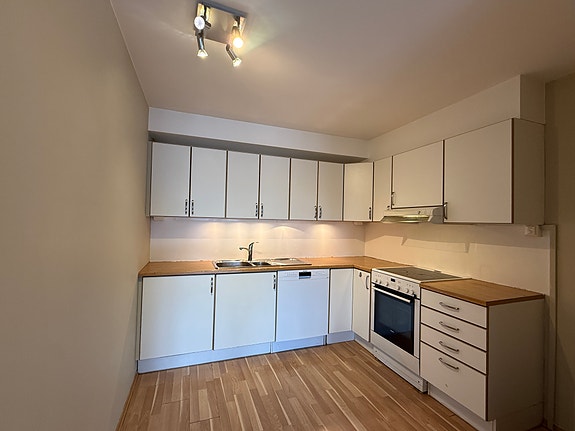 Kjøkken med god skapplass, gulvvarme, komfyr og oppvaskmaskin.