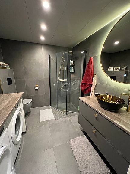 Badet er totalrenovert i juli 2023. Eksklusive detaljer og materialer. Vaskemaskin og tørketrommel under skap.