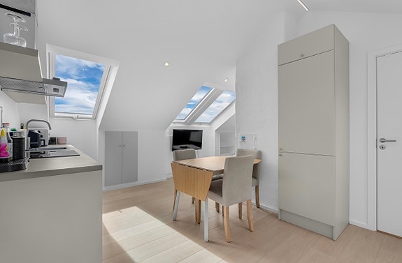 Boligen har en praktisk og arealeffektiv planløsning med to gode soverom, stue og kjøkken, samt et romslig og pent bad med god plass. Spesiallaget kjøkken fra møbelsnekker (Haugland Interiør AS) og spesiallaget garderobeløsninger av møbelsnekker i knevegger i 3.etg (Haugland Interiør AS)- så plassen er godt utnyttet.