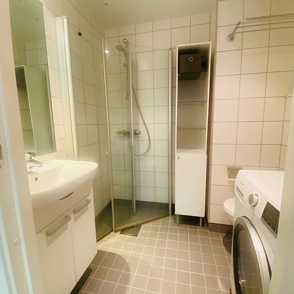 Delvis møblert med helt ny vaskemaskin og tørketrommel i ett (2025), komfyr, kjøleskap m/liten fryser, to klesskap og et skoskap.