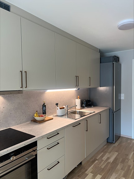 Leilighetene leveres med et flott kjøkken i beige utførelse (se bilder). Kjøkken leveres med slimline avtrekksvifte. Det er avsatt plass og opplegg for frittstående kjøleskap, komfyr, platetopp og oppvaskmaskin. Hvitevarer medbringes av leietaker, eller kan kjøpes til gunstige priser gjennom utleier slik at de står klare ved innflytting. Det er også opplegg for vaskemaskin på badet.