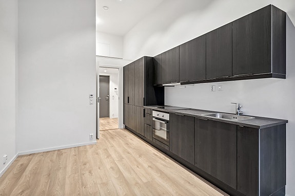 Leiligheten har god høyde under taket og store vinduer som gir godt lys. Kjøkken leveres med en hvitevarepakke som inneholder koketopp/induksjonstopp i rustfritt stål, stekeovn i rustfritt stål, integrert kjøleskap/fryseskap, integrert oppvaskmaskin og kullfilterventilator i rustfritt stål. I badene er det fliser på gulv og vegger, vegghengt toalett og dusjhjørne