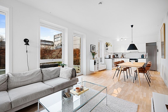 Stue og kjøkken i åpen løsning. Stuen har store vindusflater som gir godt med lys.