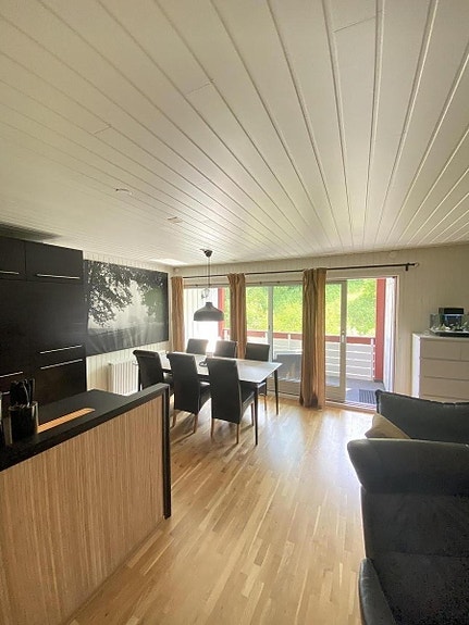 Stuen er romslig og innbydende med god plass til både sofa- og spisegruppe. Delevegg mellom kjøkkenkrok og stue er tatt bort og dette gir en ekstra luftig romfølelse. Kjøkkenet er fullt utstyrt med alle hvitevarer og komplett kjøkkenutstyr. Her kan man flytte rett inn uten behov for ytterligere investeringer.