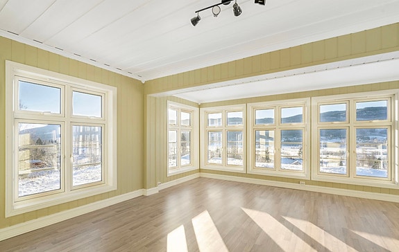 Stua og kjøkkenet er i en åpen løsning, og det er vedfyring i stua.