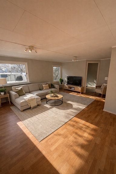 - Lys og romslig stue med plass til både sofa- og spisegruppe