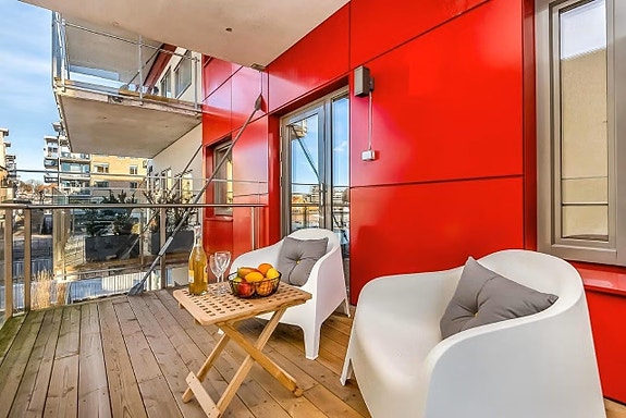 Fra stua er det utgang til en stor og overbygget balkong på hele 10 kvm. Her er det utsikt til sjøen og det nordre bryggeområdet med "Kysten" og domkirken samt at det er både morgen- og sen ettermiddagssol. På balkongen er det også stikkontakter og utelys.