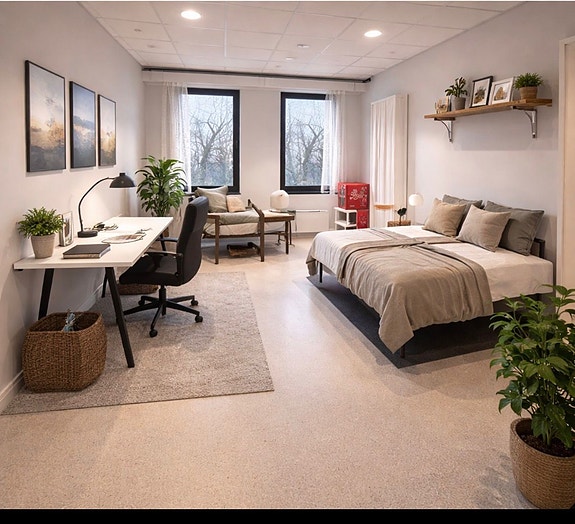 Her får du en moderne og gjennomført hybel med høy standard og svært gode fellesfasiliteter. Hybelen er utstyrt med nytt og stilrent kjøkken, seng, klesskap og bord, slik at du enkelt kan flytte rett inn.