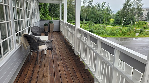 Deler av terrasse er nyrestaurert med Møre Royal terrassebord.