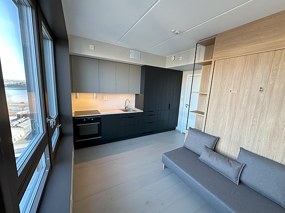 Sandvika- Helgerudkvartalet- Ny 1-roms leilighet-Fullmøblert-Fjordutsikt-Takterreasse -Oppvarming/TV/Internett/Vann