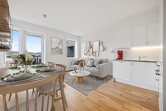 Åpen stue- og kjøkkenløsning med store vindusflater og flott utsikt.