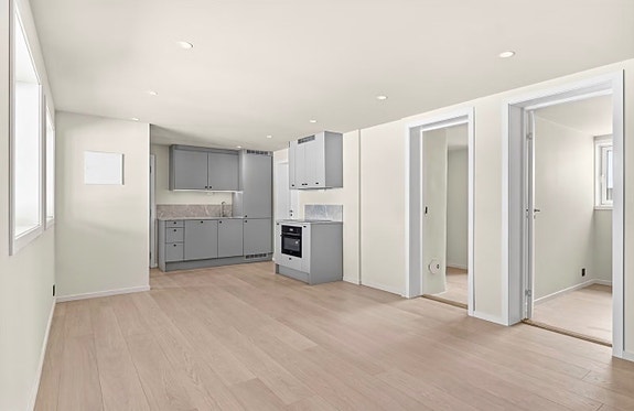 Boligen er totalrenovert i 2025 og holder høy standard. Den inneholder stue i åpen løsning mot fullt utstyrt kjøkken med integrerte hvitevarer, to soverom, eget bad med gulvvarme og separat toalettrom.