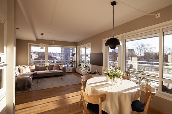 Velkommen til en elegant og attraktiv 4-roms hjørne-/frontleilighet med en enestående beliggenhet like ved Akerselva. Boligen ligger i naturskjønne og grønne omgivelser som gir en rolig og idyllisk atmosfære. Store vindusflater i flere himmelretninger sørger for rikelig med dagslys gjennom hele dagen, og den romslige balkongen på hele 20 kvm gir gode solforhold samt en flott utsikt over grønne områder, Oslo by og fjorden.