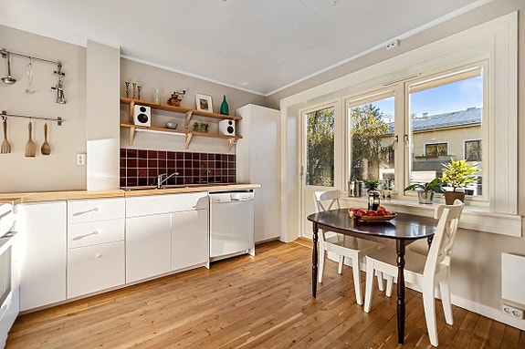 This is a big apartment with two bedrooms on the fourth floor of the building. It has a spacious feel with a big separate kitchen with an exit to a small balcony. Big windows, original wooden floors and a brick wall makes this a proper "Torshov-apartment".