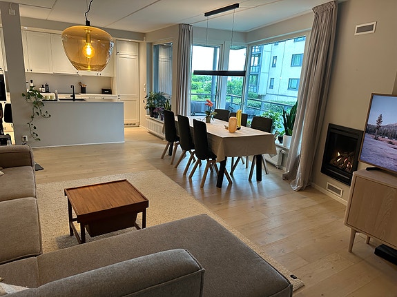 Lys og moderne 3-roms leilighet på 72 kvm i 2. etasje med heis. Leiligheten leies ut møblert og har en effektiv planløsning med to soverom, romslig stue med åpen kjøkkenløsning og utgang til en hyggelig veranda.