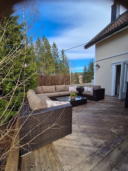 Leiligheten ligger i en enebolig i Røyken, med egen inngang, og stor terrasse, og en liten hageflekk. Den er lys og trivelig, og nylig pusset opp og er i to plan.