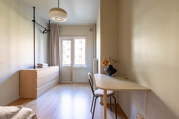 Soverom 3 med egen balkong vendt mot bakgård - Skrivebord, kommode og klesstativ