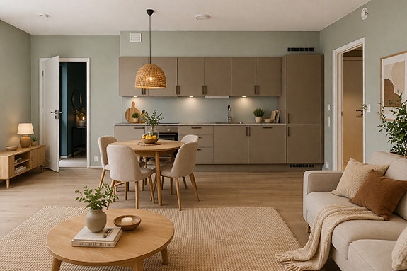 • Kjøkken: Åpen løsning med kvalitetskjøkken fra HTH og integrerte hvitevarer (komfyr, kjøleskap/fryser og oppvaskmaskin).